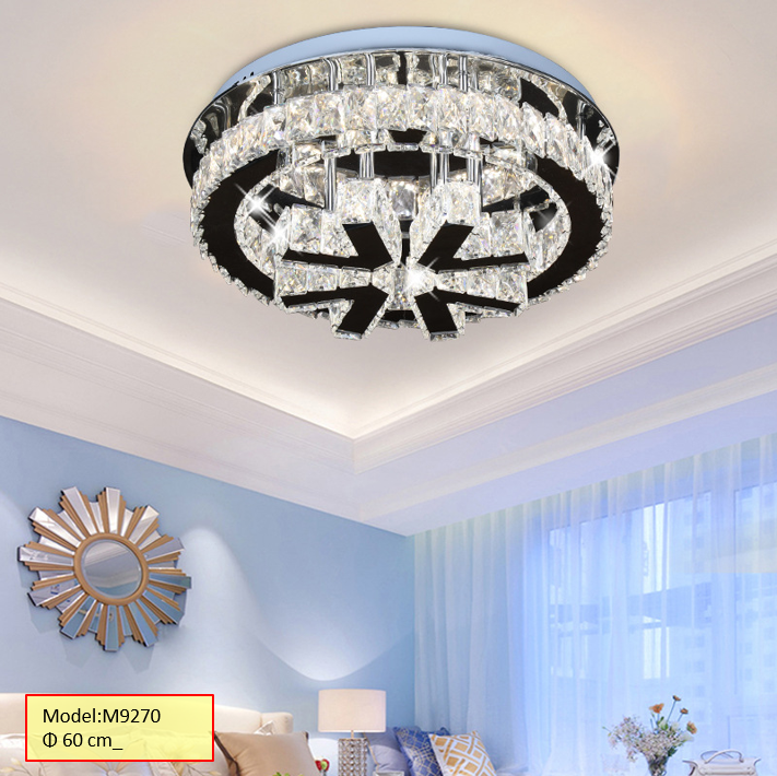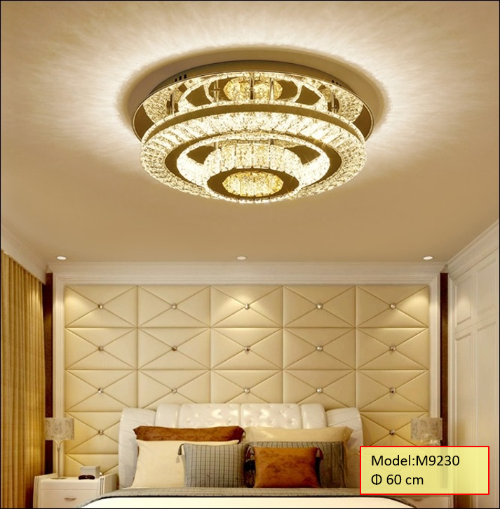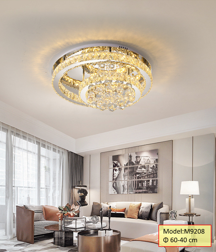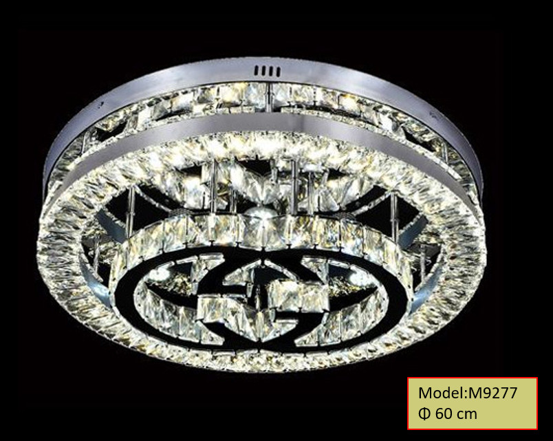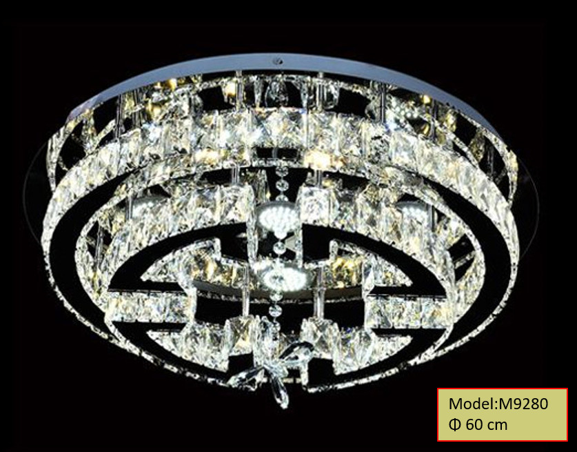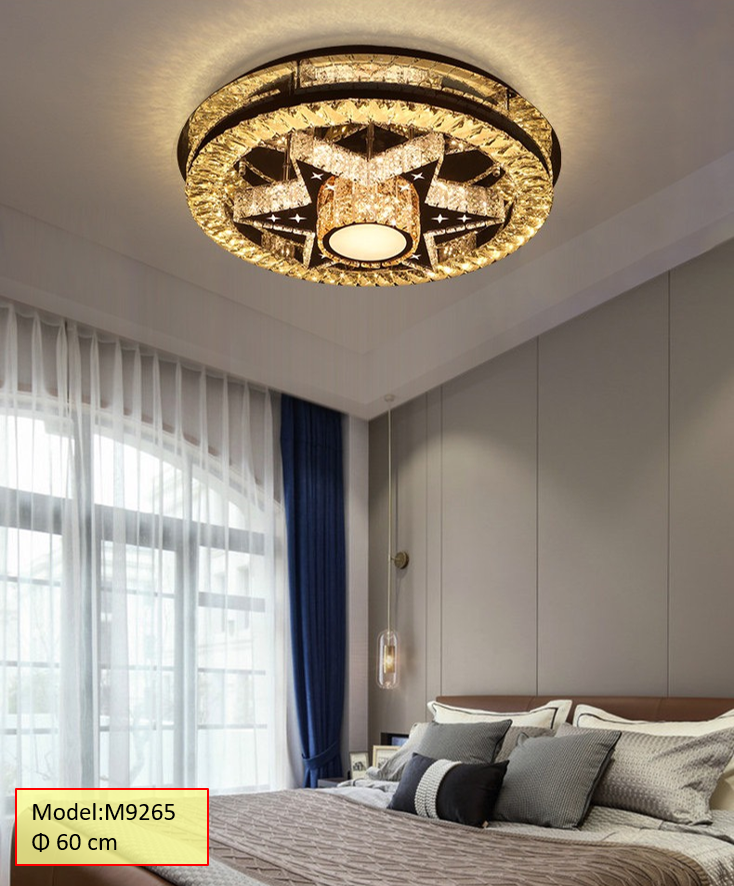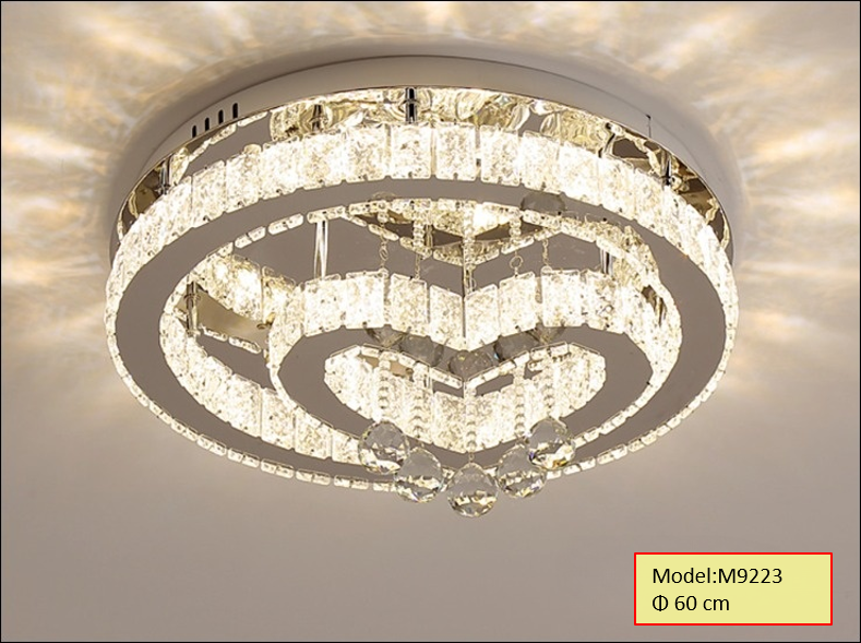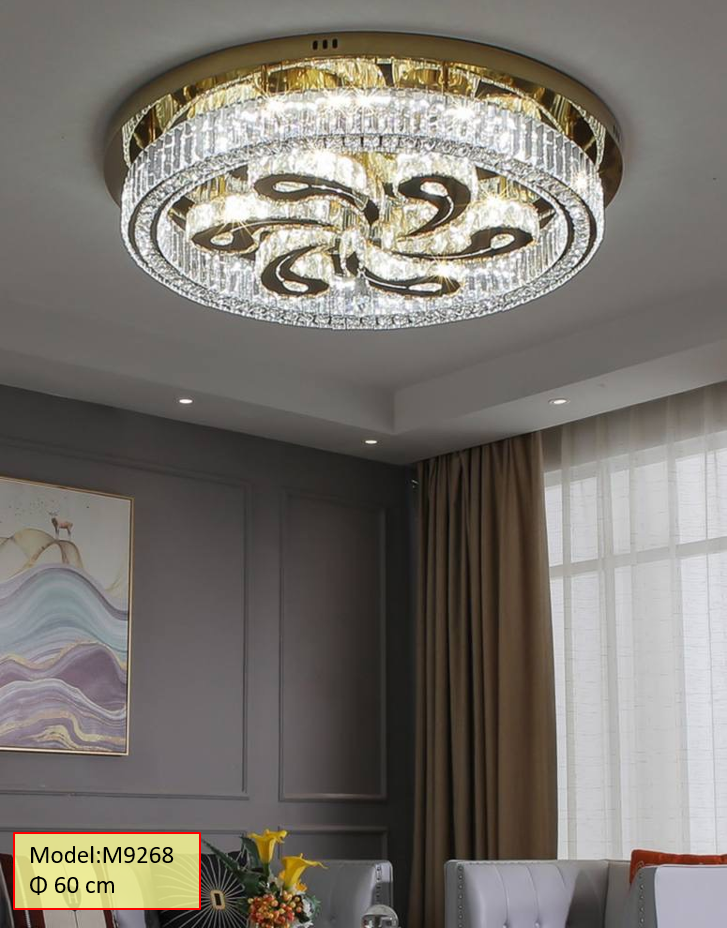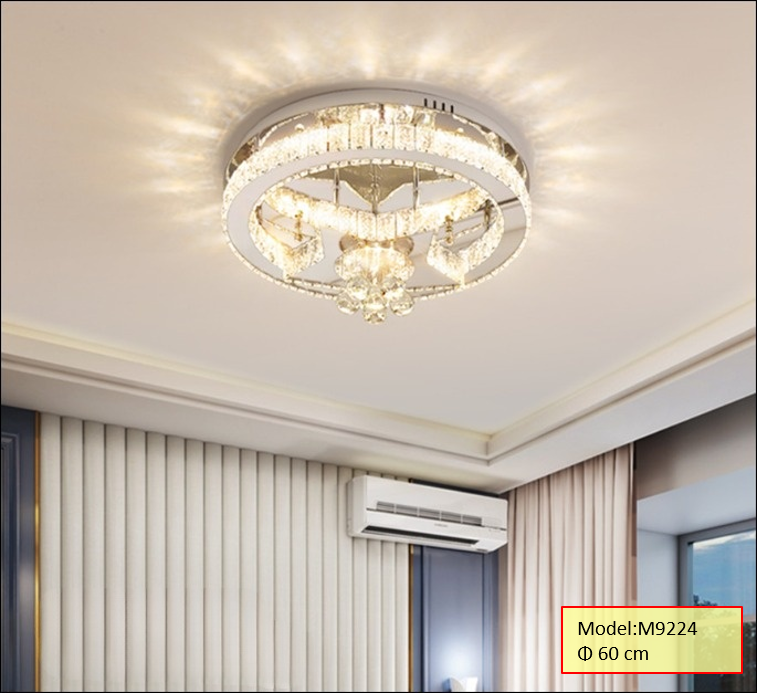 Đèn mâm pha lê Ø60cm là dòng đèn ốp trần trang trí có thiết kế dạng mâm tròn với đường kính khoảng 60cm. Đèn được kết hợp từ hai chất liệu chính là pha lê và khung đèn (thường là hợp kim sơn tĩnh điện hoặc inox cao cấp). Đây là một trong những mẫu đèn được ưa chuộng nhờ kiểu dáng hiện đại, tinh tế và khả năng tạo hiệu ứng ánh sáng sang trọng cho không gian sống.
