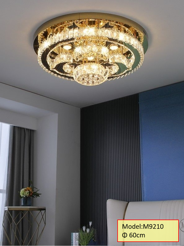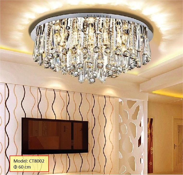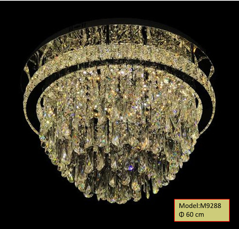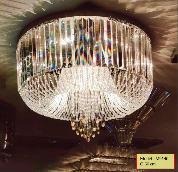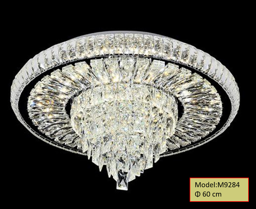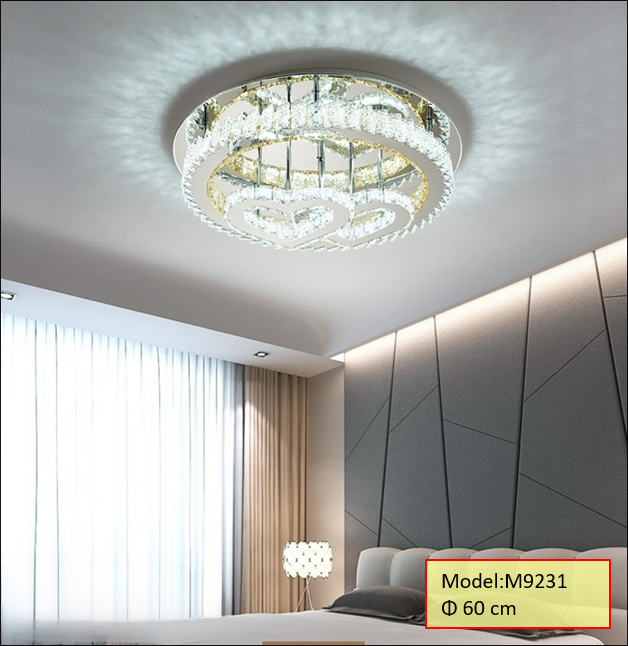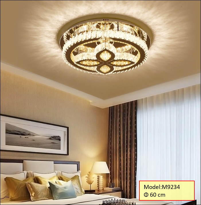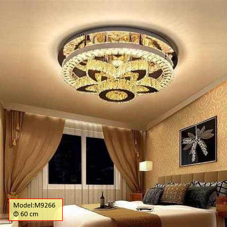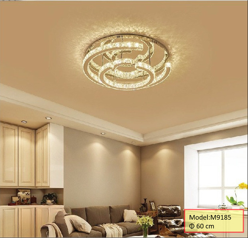 Đèn mâm pha lê Ø60cm là dòng đèn ốp trần trang trí có thiết kế dạng mâm tròn với đường kính khoảng 60cm. Đèn được kết hợp từ hai chất liệu chính là pha lê và khung đèn (thường là hợp kim sơn tĩnh điện hoặc inox cao cấp). Đây là một trong những mẫu đèn được ưa chuộng nhờ kiểu dáng hiện đại, tinh tế và khả năng tạo hiệu ứng ánh sáng sang trọng cho không gian sống.