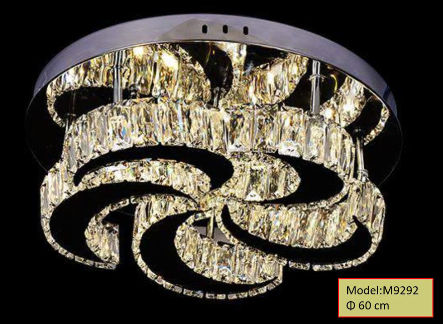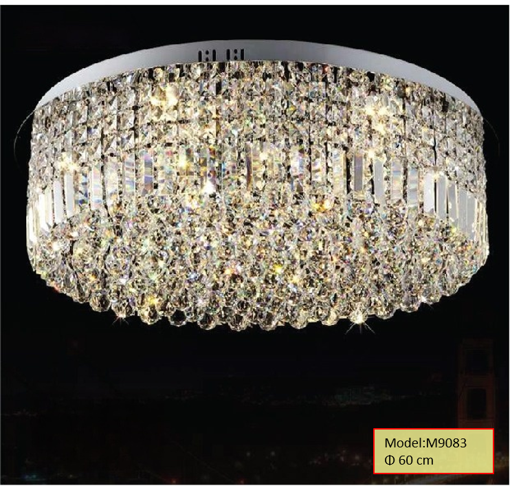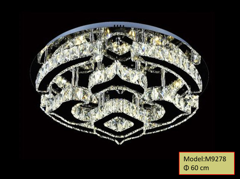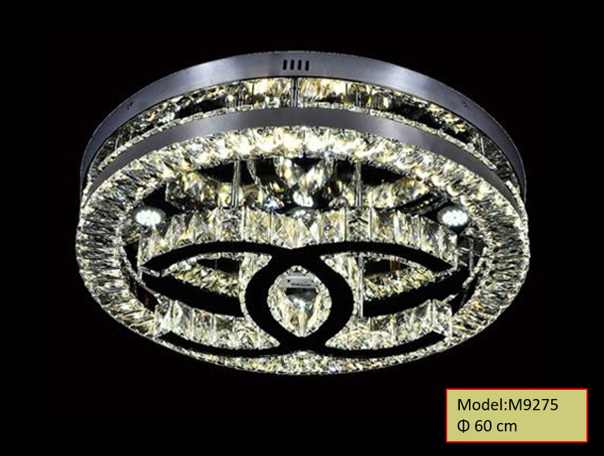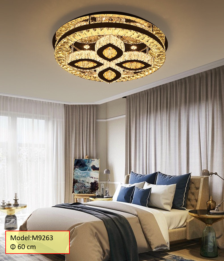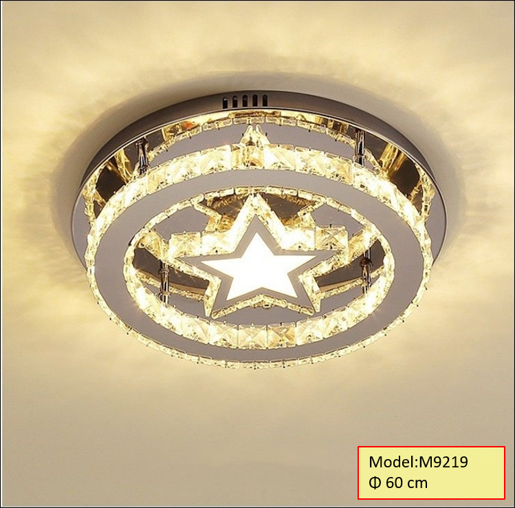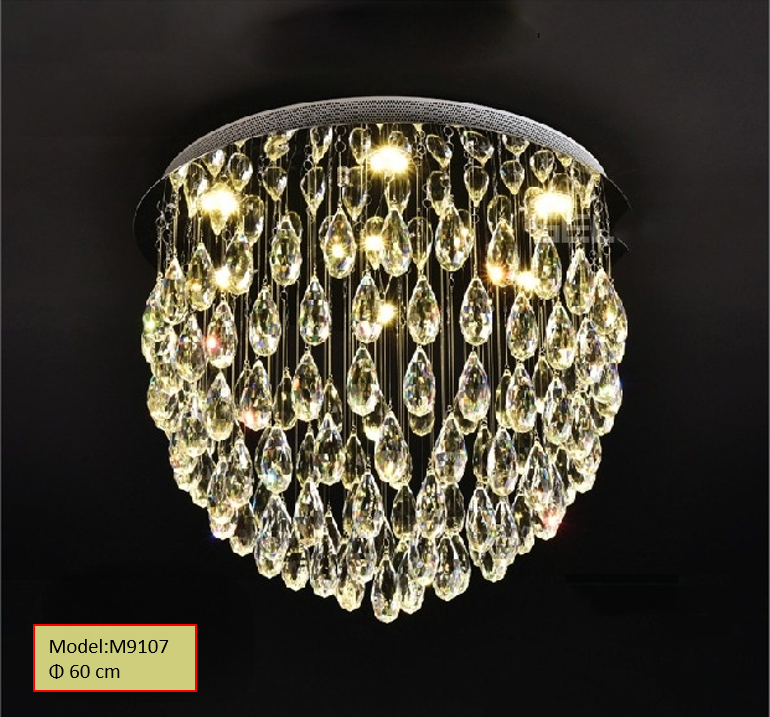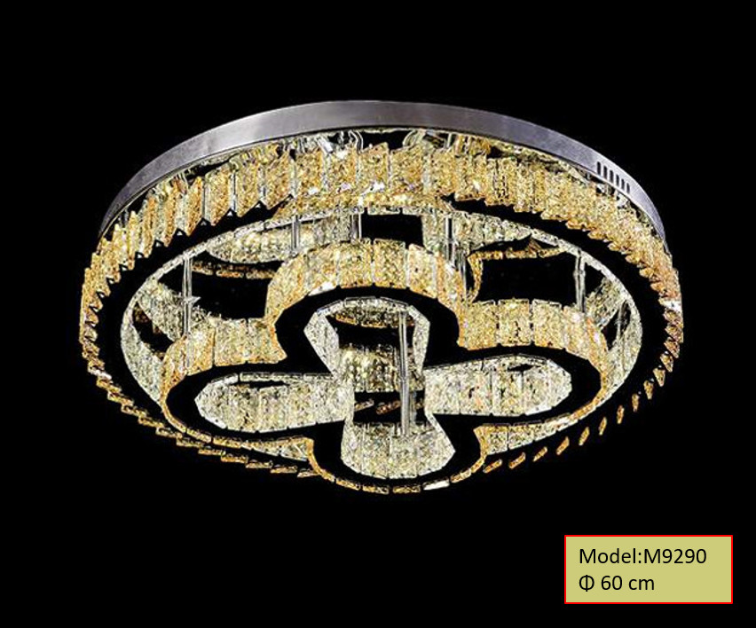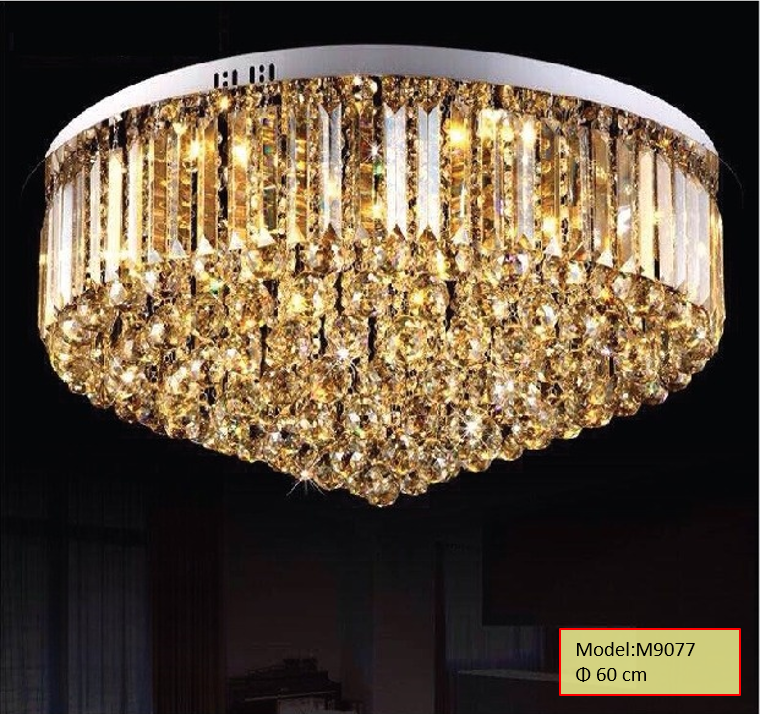 Đèn mâm pha lê Ø60cm là dòng đèn ốp trần trang trí có thiết kế dạng mâm tròn với đường kính khoảng 60cm. Đèn được kết hợp từ hai chất liệu chính là pha lê và khung đèn (thường là hợp kim sơn tĩnh điện hoặc inox cao cấp). Đây là một trong những mẫu đèn được ưa chuộng nhờ kiểu dáng hiện đại, tinh tế và khả năng tạo hiệu ứng ánh sáng sang trọng cho không gian sống.