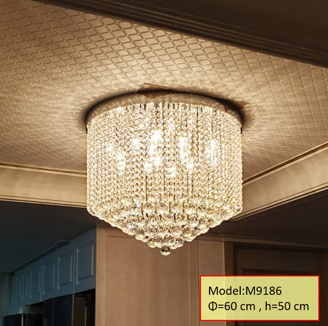 Đặc điểm của nhiều căn hộ chung cư hiện nay là trần không quá cao, thường chỉ từ 2.6–2.8m. Trong trường hợp này, đèn mâm pha lê Ø60cm là lựa chọn cực kỳ phù hợp.