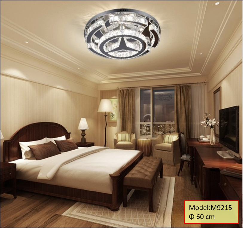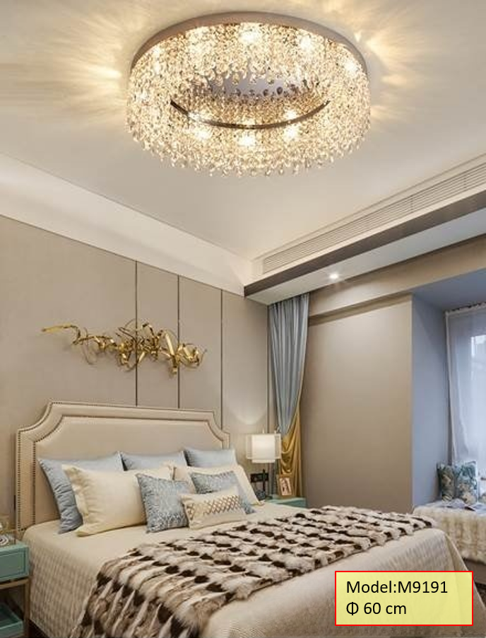 Phòng ngủ không chỉ là nơi nghỉ ngơi mà còn là không gian riêng tư cần sự nhẹ nhàng và thư giãn. Đèn mâm pha lê Ø60cm hoàn toàn có thể sử dụng cho phòng ngủ master có diện tích từ 15–20m².