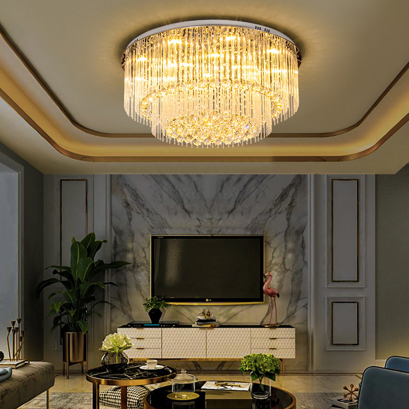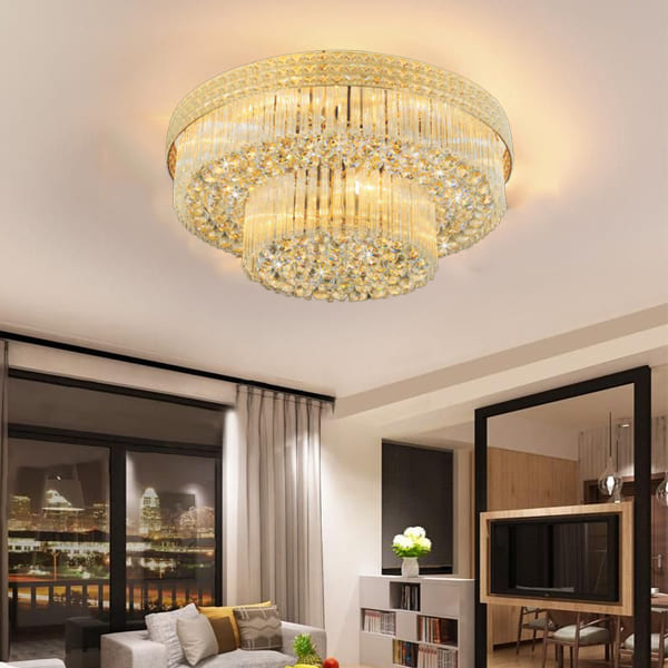 Nếu bạn muốn nâng tầm không gian ngay từ cái nhìn đầu tiên, thì đèn mâm pha lê trang trí phòng khách là lựa chọn khó bỏ qua. Khác với đèn mâm mica thiên về sự đơn giản, dòng đèn này mang lại cảm giác sang trọng rõ rệt nhờ hiệu ứng ánh sáng phản chiếu qua các hạt pha lê. Ánh sáng khi đi qua pha lê sẽ tạo ra hiệu ứng lấp lánh nhẹ, giúp phòng khách không còn đơn điệu. Đặc biệt vào buổi tối, khi bật đèn, không gian trở nên ấm áp nhưng vẫn có điểm nhấn nổi bật – kiểu đẹp mà không cần thêm quá nhiều đồ trang trí.