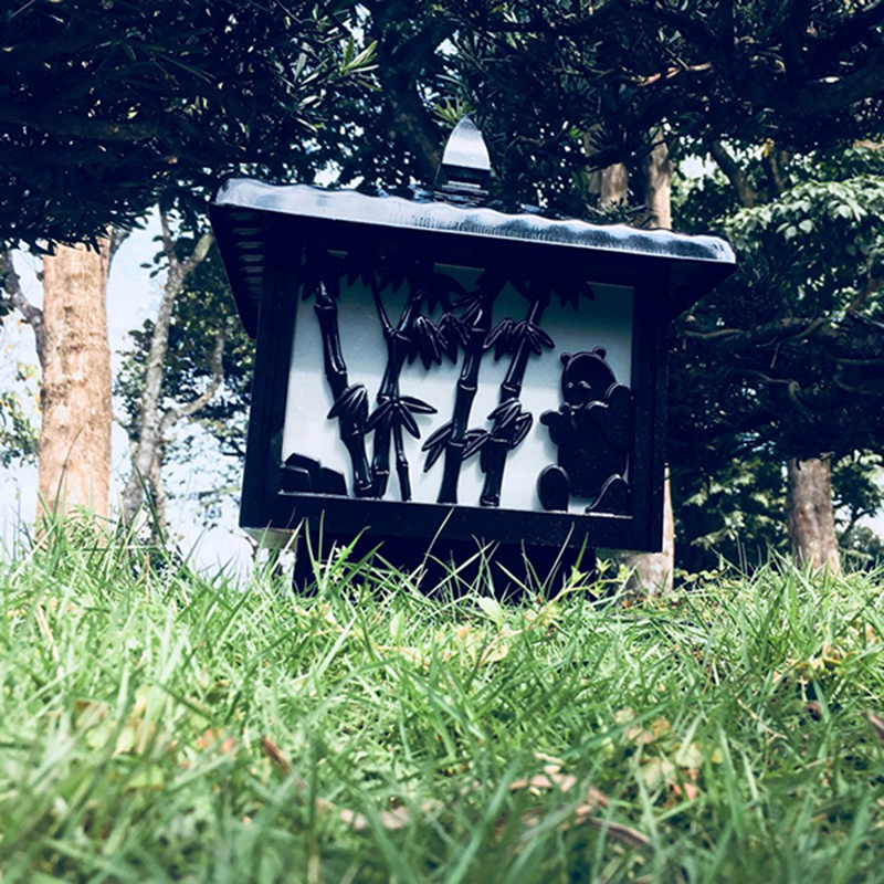 Điểm nổi bật nhất của mẫu đèn này chính là họa tiết cây tùng được chạm khắc tinh xảo trên thân đèn. Khi bật đèn vào ban đêm, ánh sáng từ bóng LED sẽ xuyên qua các khe họa tiết, tạo nên hiệu ứng ánh sáng độc đáo và ấn tượng trên tường và mặt sân.