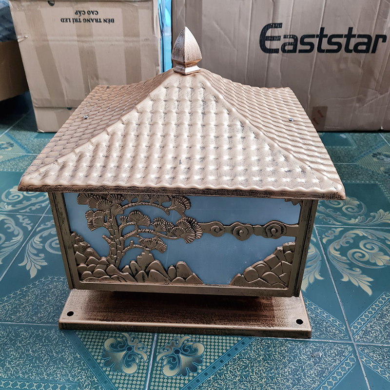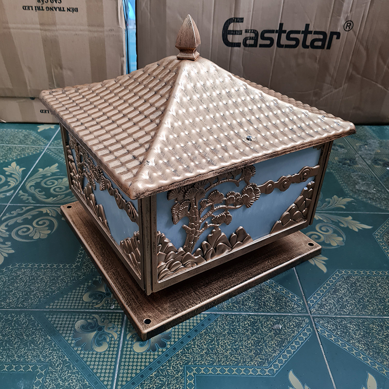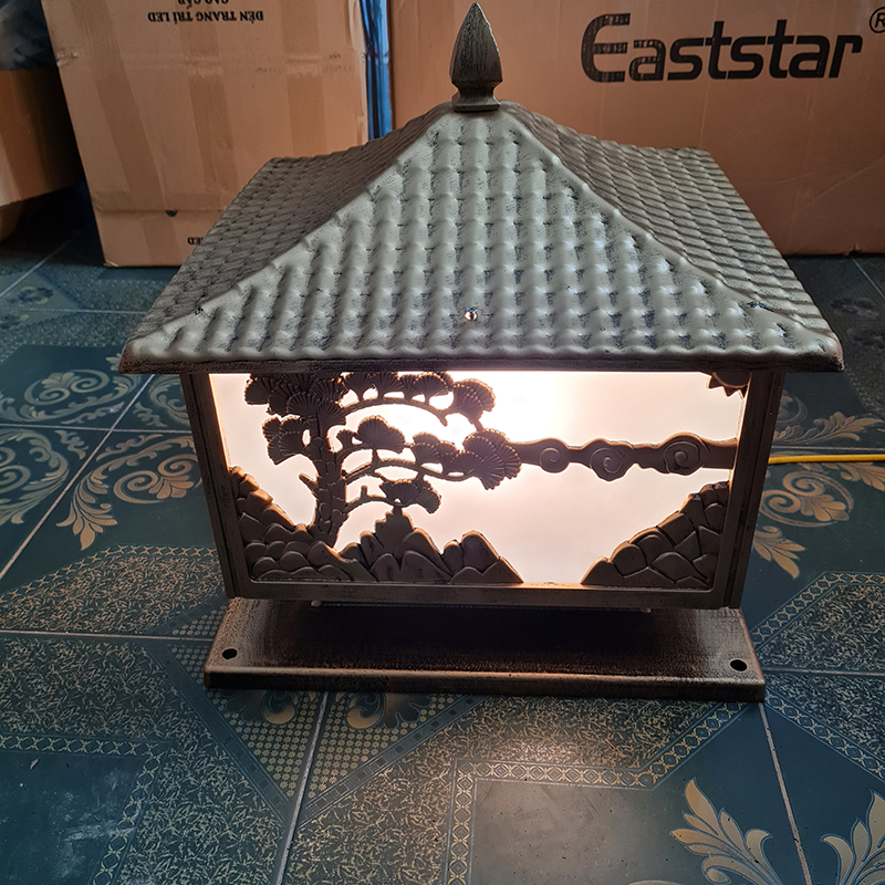 Phần thân đèn được làm từ nhôm đúc sơn giả đồng cao cấp, lớp sơn tĩnh điện này có khả năng chống gỉ bền đẹp, đảm bảo độ bền cao trong điều kiện thời tiết mưa nắng. Họa tiết cây tùng được cắt hoặc đúc sắc nét, khi đèn sáng sẽ tạo hiệu ứng ánh sáng đẹp mắt, tăng tính thẩm mỹ cho không gian cổng.