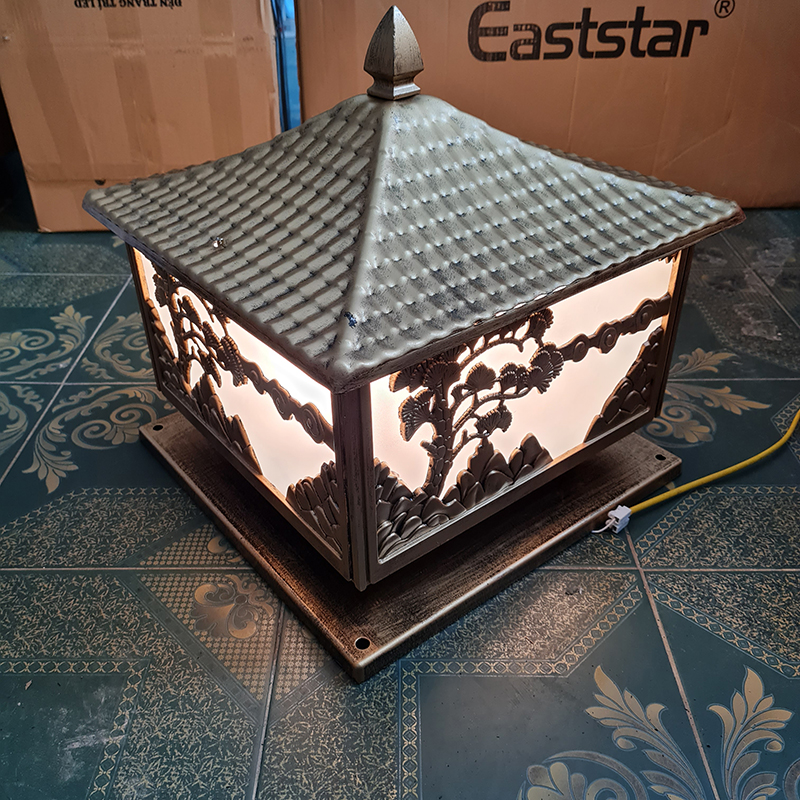 Đèn trụ cổng cây tùng và cây trúc là dòng đèn ngoại thất nổi bật nhờ thiết kế mang đậm tính nghệ thuật và dấu ấn Á Đông. Điểm đặc trưng dễ nhận biết nhất của mẫu đèn này nằm ở các họa tiết cây tùng hoặc cây trúc được gia công trực tiếp trên thân đèn. Những chi tiết này thường được cắt laser hoặc đúc nổi với độ sắc nét cao, giúp tạo nên hiệu ứng ánh sáng độc đáo khi đèn được bật vào ban đêm. Ánh sáng xuyên qua các khe họa tiết sẽ tạo ra những hình bóng sinh động trên tường và mặt sân, góp phần làm nổi bật không gian cổng nhà.