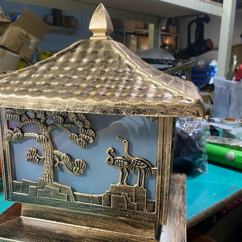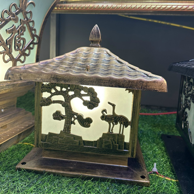 Điểm nhấn đặc biệt của mẫu đèn nằm ở họa tiết cây tùng kết hợp hình ảnh chim hạc được chạm khắc tinh xảo trên thân đèn. Những đường nét mềm mại, sống động tạo nên một tổng thể hài hòa và đậm chất nghệ thuật. Khi đèn được bật vào ban đêm, ánh sáng LED xuyên qua các họa tiết sẽ tạo hiệu ứng ánh sáng độc đáo, làm nổi bật không gian cổng nhà.