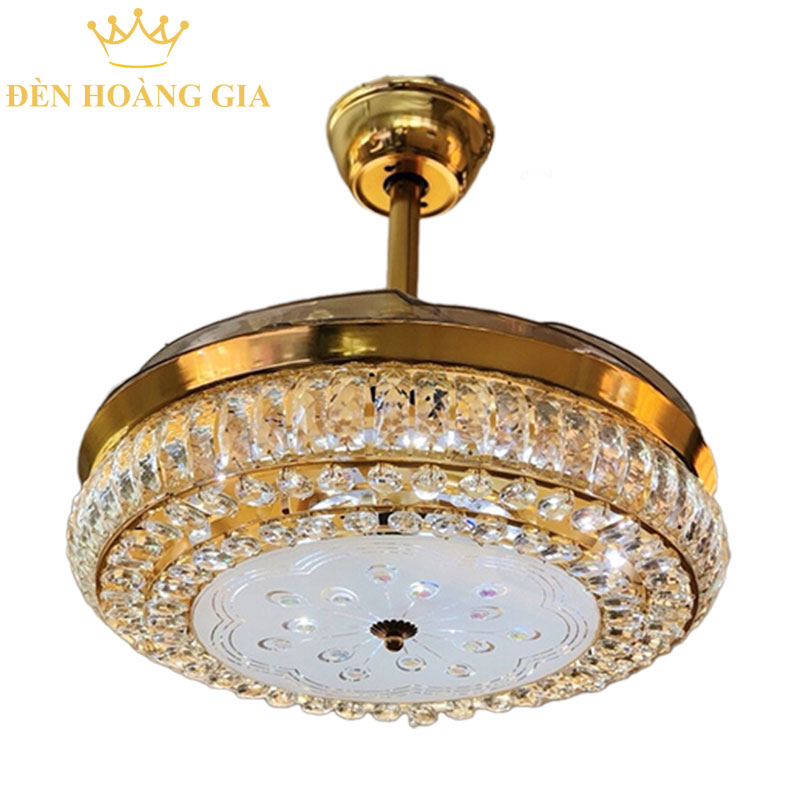 - Quạt trần đèn cánh cụp cánh xòe pha lê