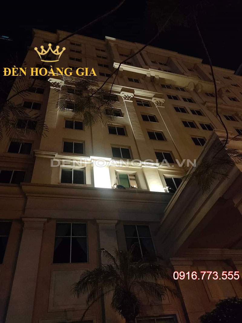 Công trình trên đây là một vách tường của một mặt dựng tòa nhà tương đối lớn. Công trình cao hơn 10 tầng. Khu vực vách tường cần chiếu sáng có bề ngang khá rộng. Nếu bình thường với độ cao như vậy các bạn có thể lựa chọn lắp đèn led rọi cột 45w/54w. Tuy nhiên, vì vách tường lớn nên lựa chọn được đề xuất là đèn led rọi cột 81w kết hợp với kỹ thuật căn chỉnh cách lắp đèn để có hiệu quả chiếu sáng tốt nhất.